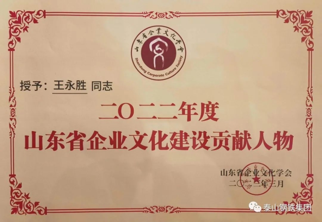 3月26日,山东省企业文化建设发展大会在临沂召开。会上表彰了2022年度山东省企业文化建设先进单位和个人。其中,泰山钢铁集团被授予“2022年度山东省企业文化建设先进单位”荣誉称号,集团党委书记、董事长王永胜获得“2022年度山东省企业文化建设贡献人物”荣誉称号。
