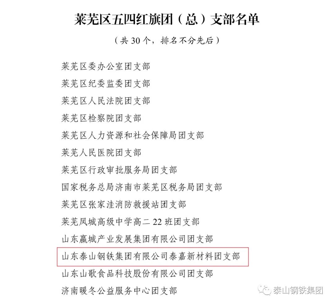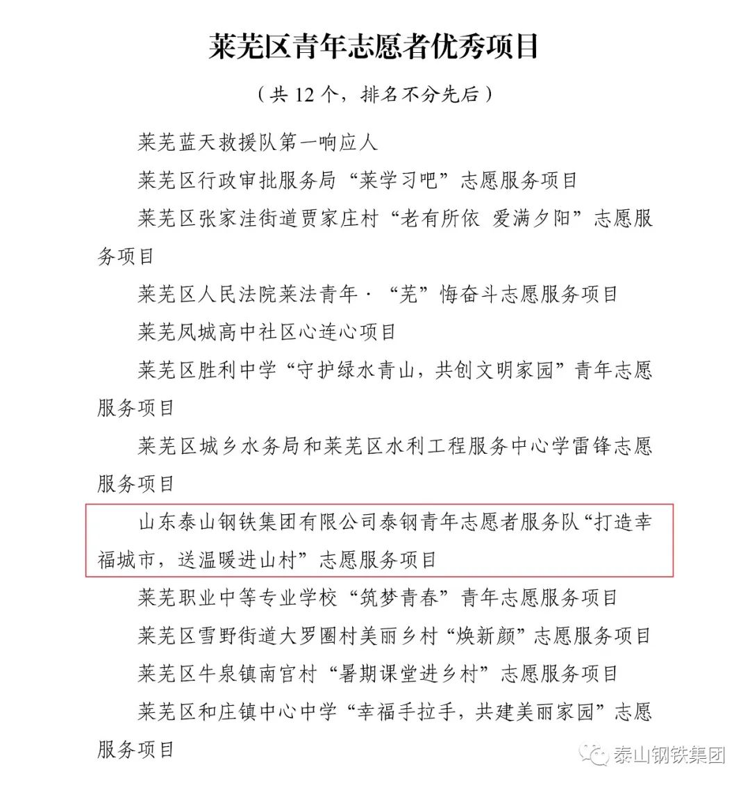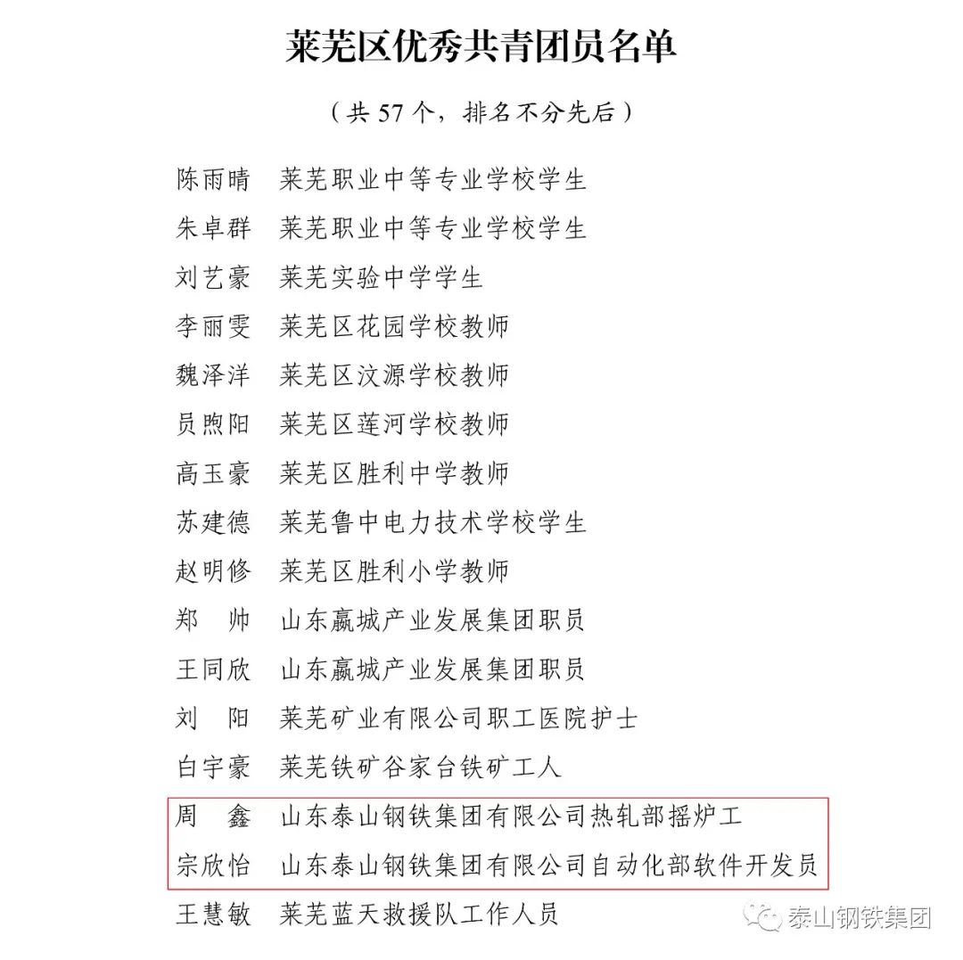 近日,共青团济南市莱芜区委下发文件《关于2022年度莱芜区五四典型的表扬通报》,表彰了一批先进单位和个人。其中,泰山钢铁集团团委上榜“莱芜区五四红旗团委”名单,泰嘉新材料团支部上榜“莱芜区五四红旗团(总)支部名单”,职工周鑫、宗欣怡上榜“莱芜区优秀共青团员名单”,职工李娟上榜“莱芜区优秀共青团干部名单”,职工亓敬坤、刘兆国被评为“莱芜区青年志愿者优秀个人”,赢博(中国)青年志愿者服务队“打造幸福城市,送温暖进山村”志愿服务项目被评为“莱芜区青年志愿者优秀项目”。