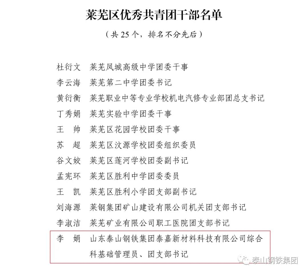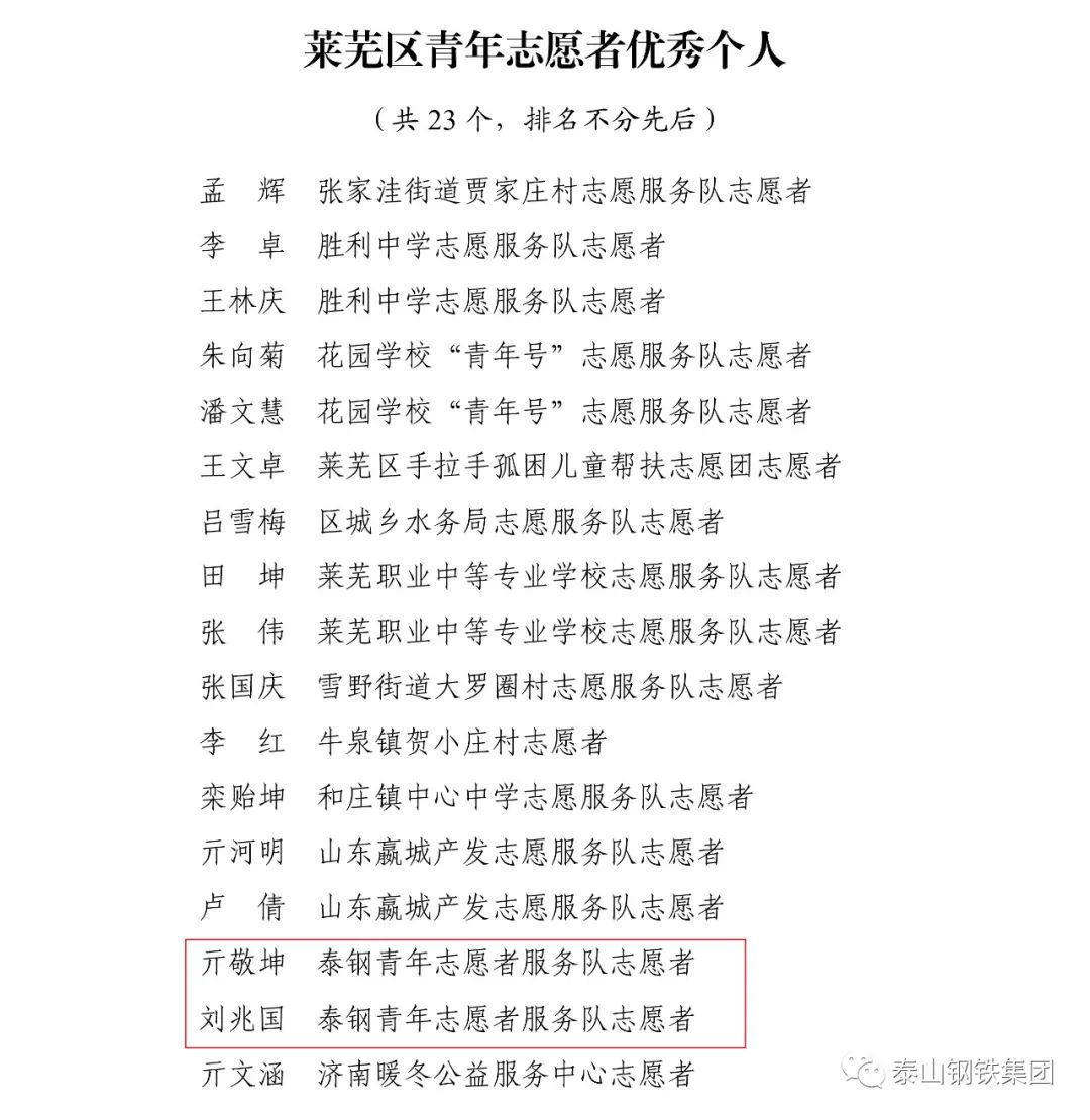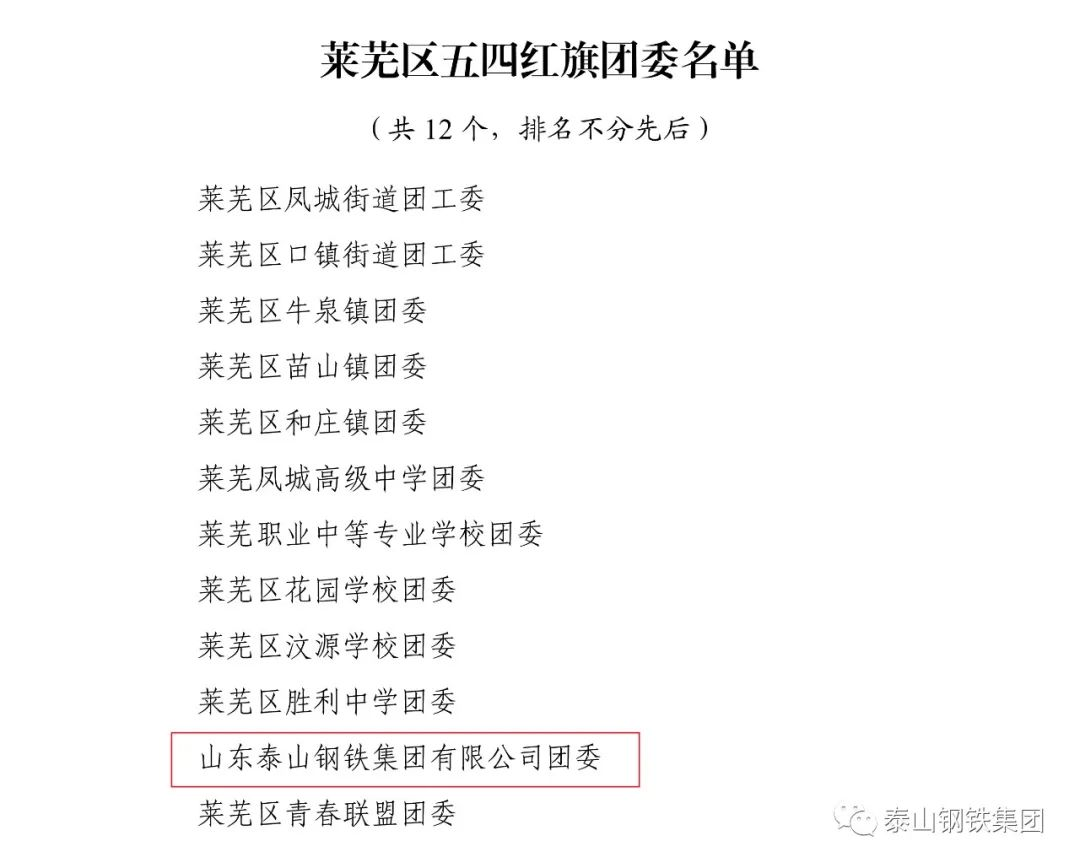 近日,共青团济南市莱芜区委下发文件《关于2022年度莱芜区五四典型的表扬通报》,表彰了一批先进单位和个人。其中,泰山钢铁集团团委上榜“莱芜区五四红旗团委”名单,泰嘉新材料团支部上榜“莱芜区五四红旗团(总)支部名单”,职工周鑫、宗欣怡上榜“莱芜区优秀共青团员名单”,职工李娟上榜“莱芜区优秀共青团干部名单”,职工亓敬坤、刘兆国被评为“莱芜区青年志愿者优秀个人”,赢博(中国)青年志愿者服务队“打造幸福城市,送温暖进山村”志愿服务项目被评为“莱芜区青年志愿者优秀项目”。